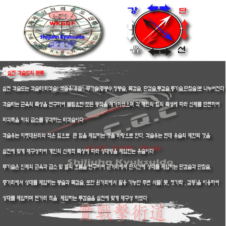 Kyeoksulyu is based on the idea of defeating an enemy of strong power with small power using individua'sl power characteristics. Kyeoksulyu is a jujitsu technique which improved the contemporary jujitsu which is very restricted in many aspects, by reorganizing it to be fit to actual situations.
